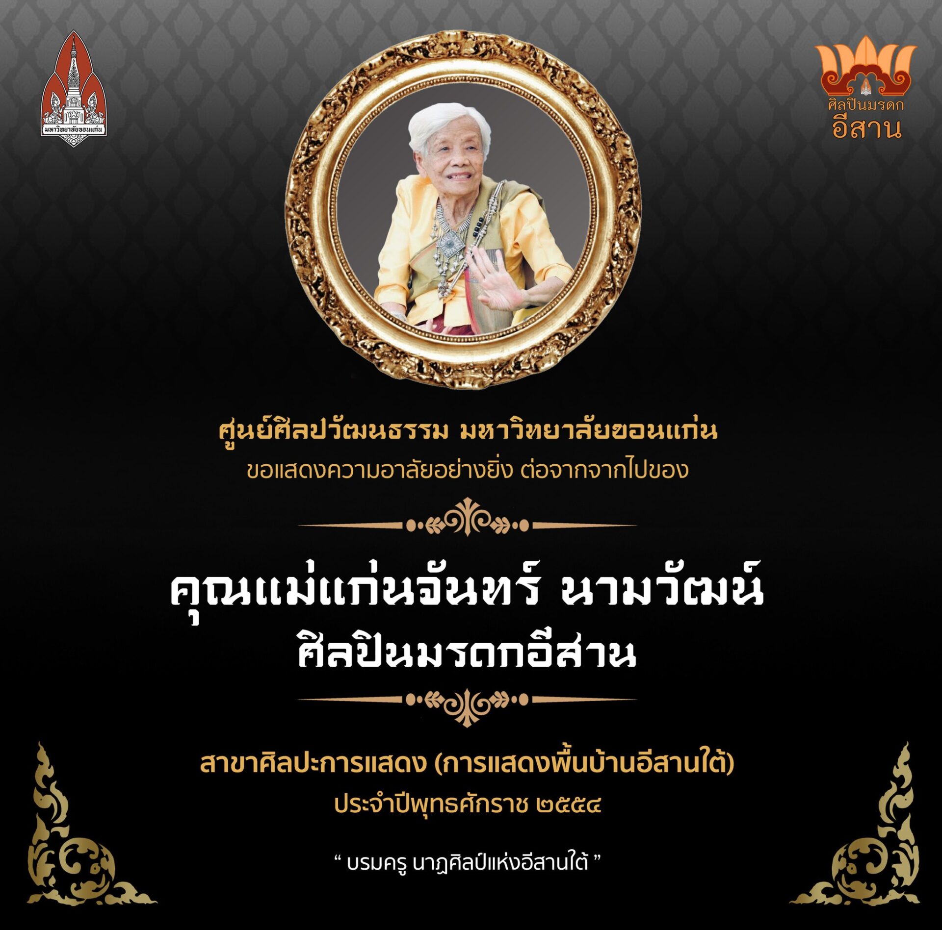 ศูนย์ศิลปวัฒนธรรม มหาวิทยาลัยขอนแก่น ขอแสดงความอาลัยอย่างยิ่ง ต่อจากจากไปของ คุณแม่แก่นจันทร์ นามวัฒน์ “ บรมครู นาฏศิลป์แห่งอีสานใต้ ”