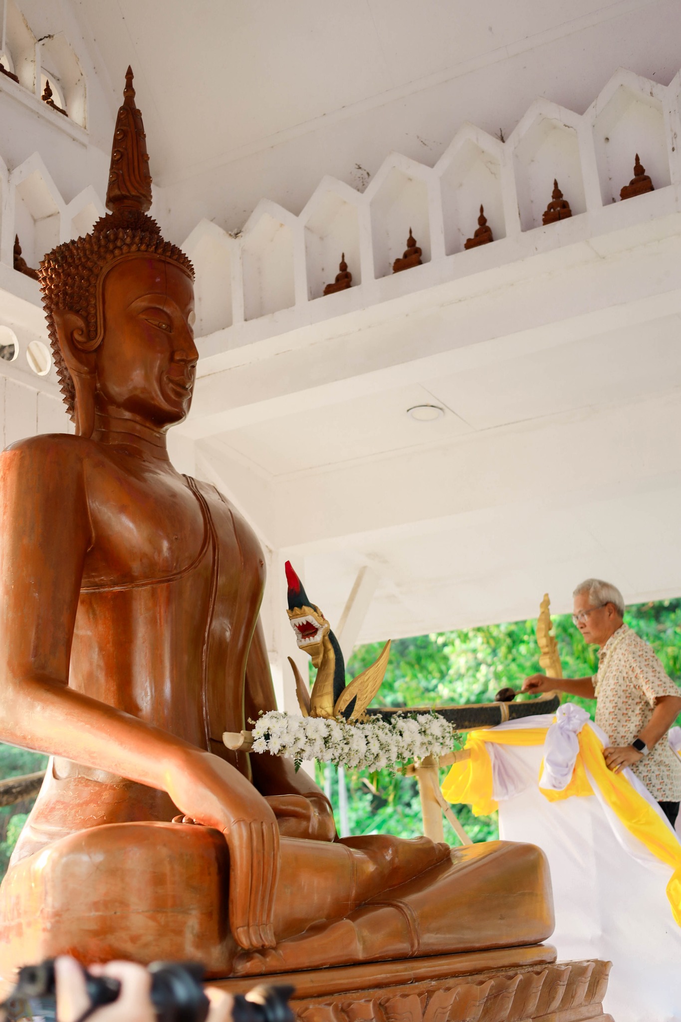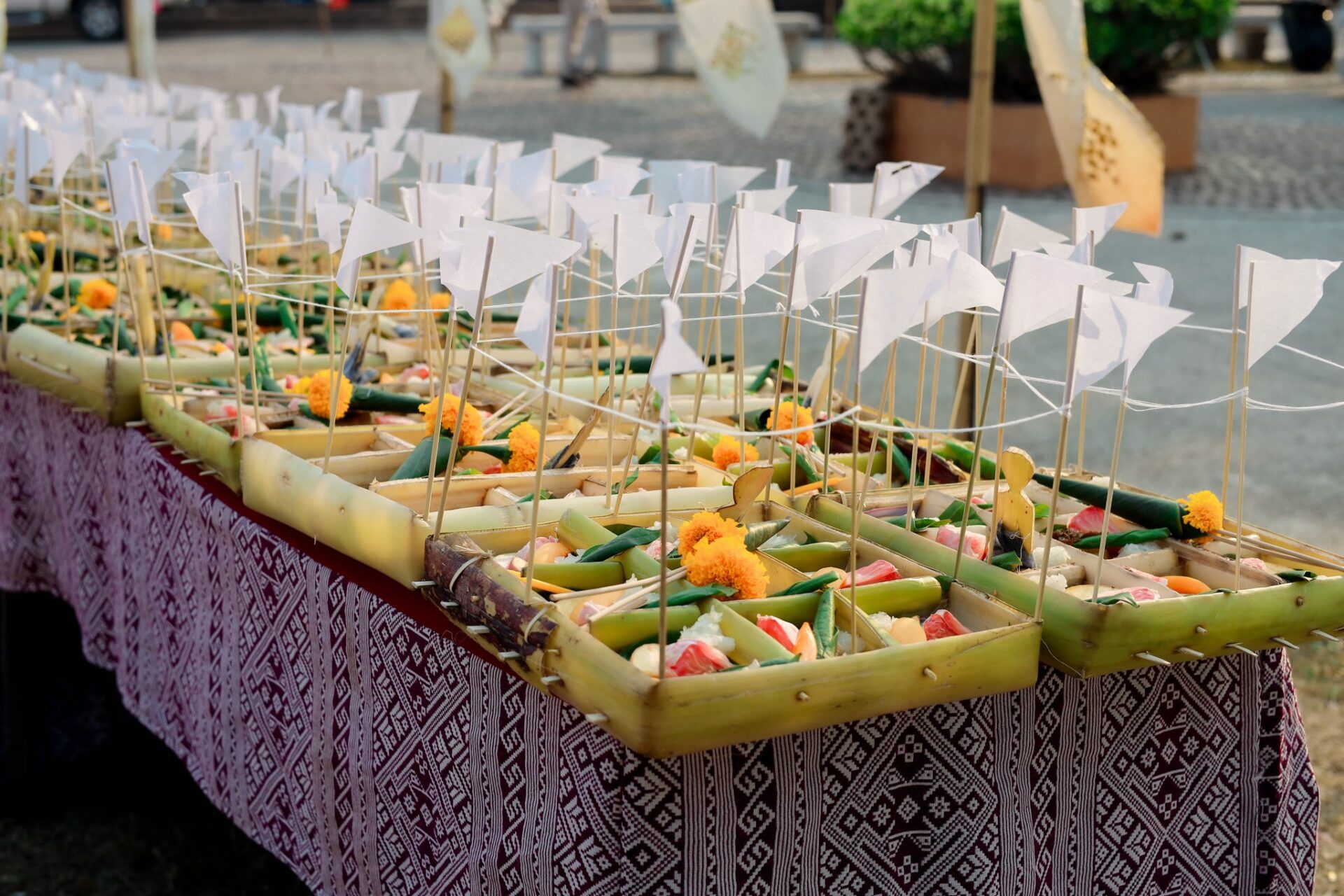 Activities included traditional zodiac-based merit rituals for dispelling misfortune, the ceremonial bathing of Buddha images and a replica of Phra That Phanom stupa for good fortune during the Thai New Year, the traditional water-pouring ceremony to ask blessings from senior members (Somma Awuso), a Buddhist procession, and a Tob Prathai (sand pagoda building) contest. These activities highlighted the faith, beliefs, and traditional way of life of the Isan people.